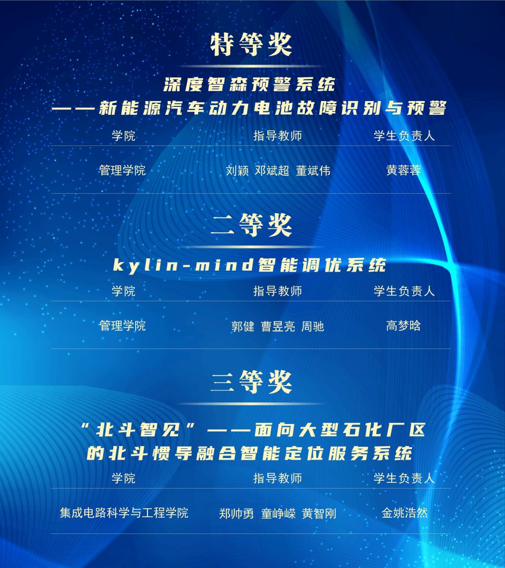 2024年度“揭榜挂帅”专项赛设置高校学生赛道和青年科技人才赛道,共吸引2.7万余人参加、6500余件作品参赛,最终来自全国410余所高校和企业的1950余件作品入围终审决赛。贝博管理学院“深度智森预警系统——新能源汽车动力电池故障识别与预警”项目荣获全国特等奖;管理学院“kylin-mind智能调优系统”项目荣获全国二等奖;集成电路科学与工程学院“‘北斗智见’——面向大型石化厂区的北斗惯导融合智能定位服务系统”项目荣获全国三等奖。
