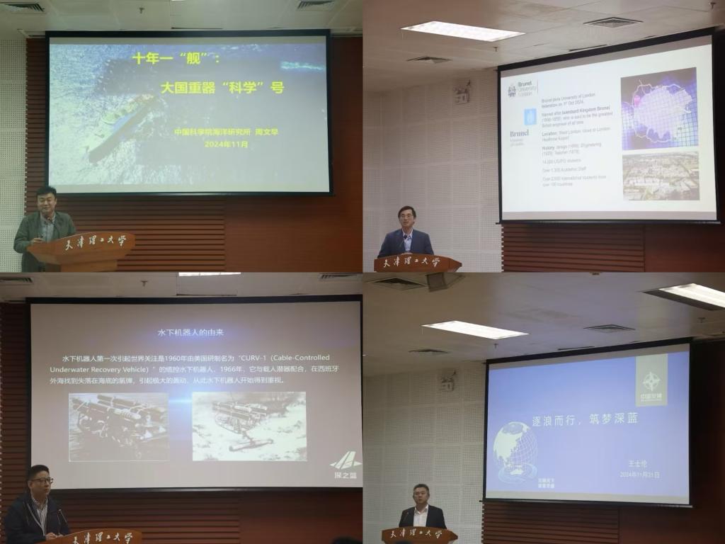 在学术交流环节,中国科学院海洋研究所工程技术部副主任、高级工程师周文早以《十年一“舰”:大国重器“科学”号》为题,讲述了我国海洋科学在创新发展中成长壮大的历程和“深海宇航员”ROV的操作与应用。刘奇围绕水下机器人在水下应急搜救领域的应用等内容向广大师生进行了分享,并探讨了研究生工作站的运行模式。英国伦敦布鲁内尔大学教授、英国研究与创新署未来领袖研究员王新颜对当前交通动力系统在低碳零碳趋势下的挑战及机遇、氢气和氨气发动机技术的研究现状及趋势、可用于未来交通领域的低碳及零碳燃料发展趋势等内容进行了分享。天航疏浚公司副总经理、总船长王士伦结合自身经历,以《逐浪而行,筑梦深蓝》为题作报告。学术报告内容丰富、涉及面广、实用性强,令现场师生深受启发。