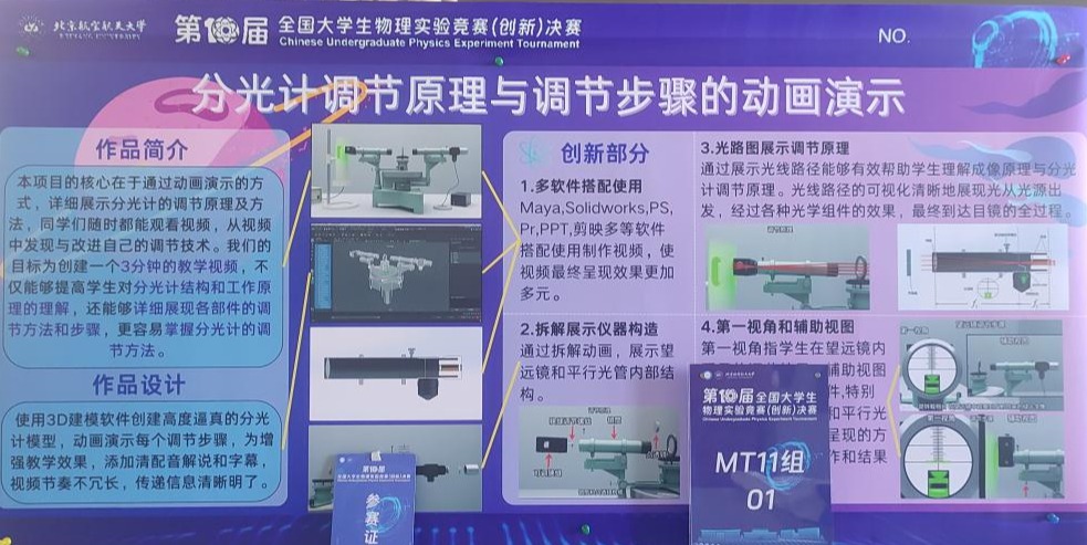 自赛事开展以来,贝博充分发挥学科优势,积极组织学生报名参赛,进行相关培训。参赛学生涵盖理学院、集成电路科学与工程学院、材料科学与工程学院等多个学院。经过校赛、市赛复赛及网络评审等环节,8支参赛队伍参加市赛,并荣获市级一等奖1项、市级二等奖4项、市级三等奖3项。最终,学校4支队伍被推荐参加全国总决赛。经过参赛师生的悉心准备和精彩现场展示,由物理实验中心教师李晓兰指导,学生赵朝源、马福祥、陈祥瑞、张逸成参与的《分光计调节原理与调节步骤的动画演示》作品获自选命题类全国决赛一等奖;由物理实验中心教师于丹指导,学生冯杰、贾云博、廖海琅参与的《空气中声速的测定》作品获讲课类全国二等奖。