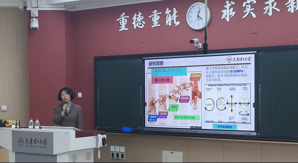学校机械工程学院高丽兰教授作题为《关节软骨缺损修复的力学行为研究》的学术报告。基于力学载荷下关节软骨缺损会影响软骨的力学功能,加速软骨的损伤的研究背景,她针对软骨不同缺损程度建议采用的干预修复方法,阐述了体外组织工程成熟培养后修复关节软骨缺损的必要性。