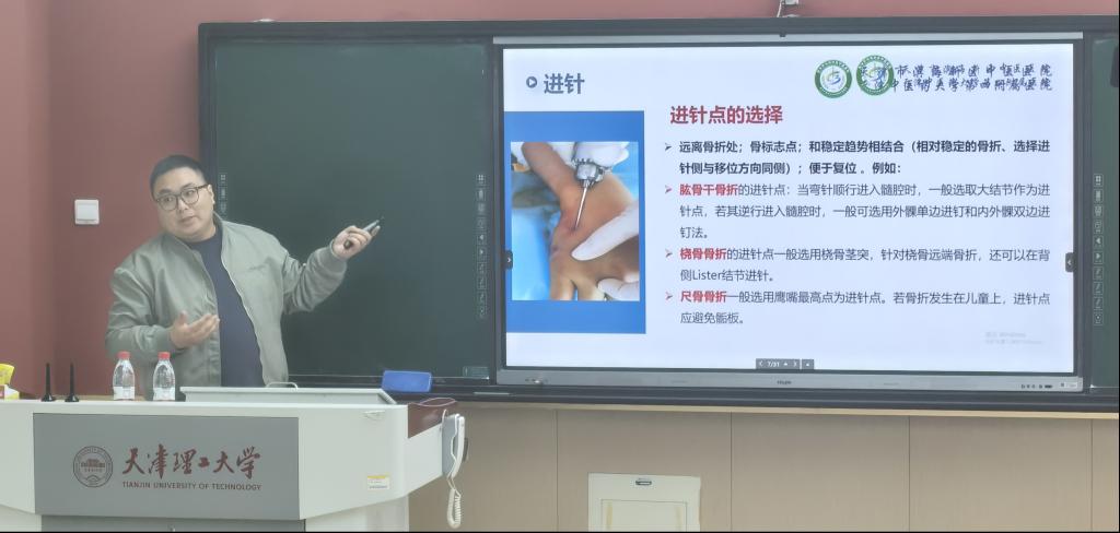 天津滨海新区中医医院骨伤科段立强作题为《金针复位技术》的报告。他表示,金针复位是以古法“金针拨骨”理念为指导的一项增加复位效能的技术,是对正骨八法复位能力的补充。金针复位基本技法包括:“弯针”“进针”“行针”“旋针”“顶针”等,可使骨折端达到近解剖的复位。