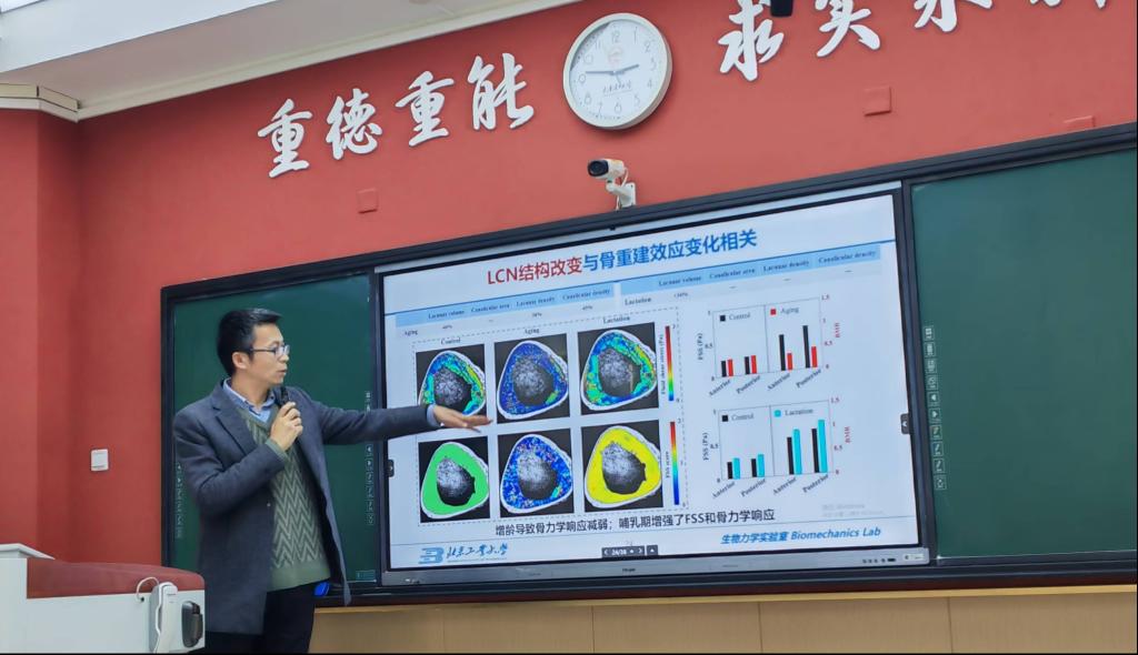 北京工业大学杨海胜教授作题为《力调控骨重建生物力学机理的微观解析》的学术报告。他回顾了骨功能适应性理论研究历史,详细阐述了团队在阐明骨重建中微观陷窝——小管网络流体剪应力重要作用的研究进展,研究结果表明骨细胞网络改变会影响流体动力学的微环境,进而影响骨的重建,这与骨质疏松相关。