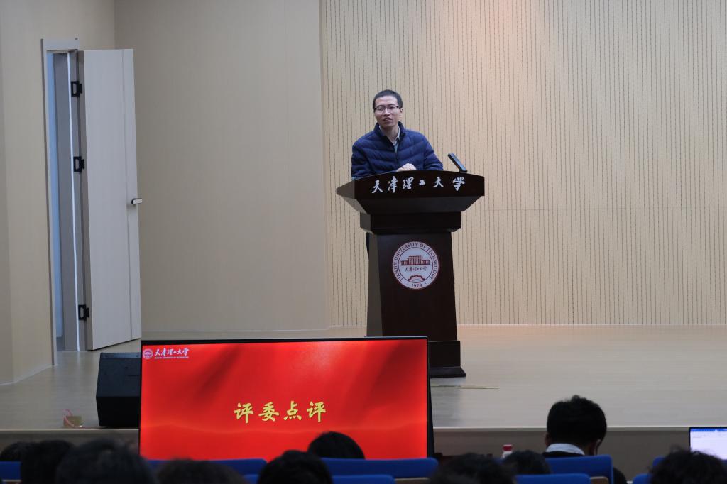 天津科技大学智能制造产业学院副主任房德磊进行点评。他表示,参赛选手用扎实的基础和饱满的精神状态展现了一场精彩的比赛,希望同学们不断夯实科研基础,勇于挑战传统思维,对标国家战略和社会需求,不断促进项目的创新和转化。