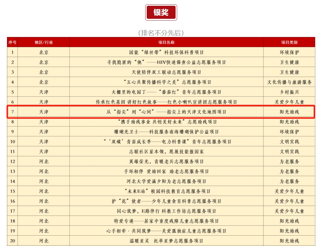 日前,第七届中国青年志愿服务项目大赛在广东汕头落下帷幕。贝博聋人工学院申报的志愿服务项目“从‘指尖’到‘心间’——指尖上的天津文化地图”入围国赛终评。该项目通过线下路演答辩,评委、监委线下集中评审,最终斩获银奖。