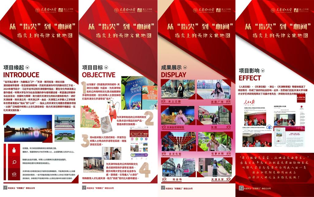 该项目以冯骥才《热爱我求学的城市天津文化地图》为蓝本,为天津市知名的公共场所和文化景点拍摄录制手语导览视频,设计文创产品,并计划将AI技术融入沉浸式体验,开发符合听障人士特点的手语导览系统,优化游览效果,打造天津文化手语导览“名片”,引导聋人“小清华”特殊教育人才扎根天津、服务天津。