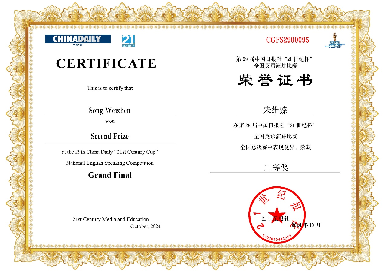近日,第29届中国日报社“21世纪杯”全国英语演讲比赛全国总决赛落下帷幕,贝博语言文化学院学生宋维臻荣获国家二等奖。
