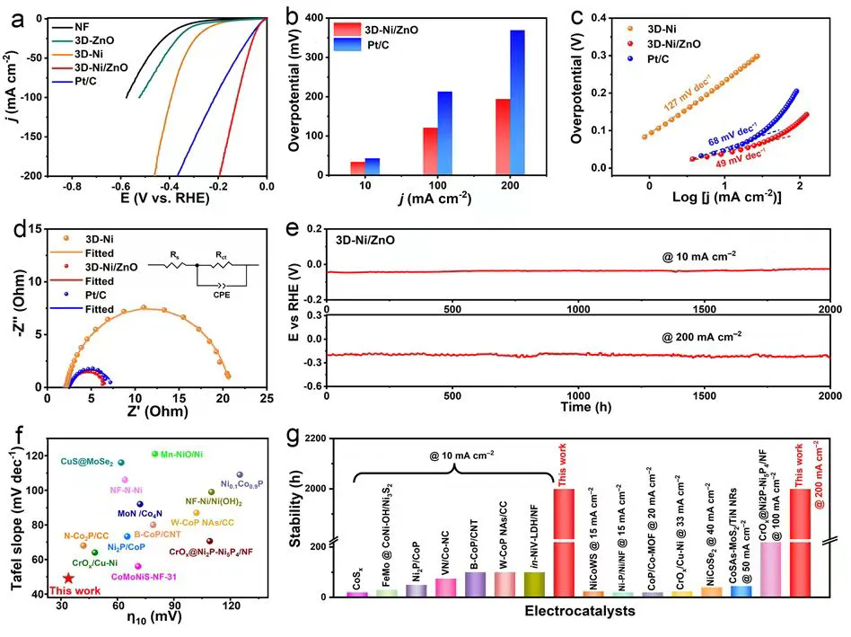 HER性能测试表明,3D-Ni/ZnO表现出优异的HER活性,仅需34、121和194 mV的过电位即可分别获得10、100和200mA cm-2的电流密度,性能显著优于Pt/C催化剂。Tafel斜率分析显示,相对于Ni催化剂,3D-Ni/ZnO的HER机制从Volmer控制步骤转变为效率更高的Volmer-Heyrovsky机制。此外,3D-Ni/ZnO能够在10和200mA cm-2的电流密度下稳定运行超过2000小时,展现出优异的耐久性。综合来看,本文发展的3D-Ni/ZnO催化剂在活性和稳定性上优于大多数文献报道的中性HER催化剂。
