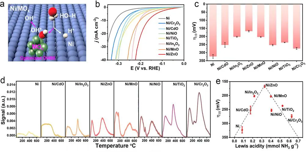 本研究利用通用的方法合成一系列Ni/MOx异质结构催化剂,并系统研究其在中性电解液中的HER活性。进一步通过氨气程序升温脱附(NH3-TPD)测定催化剂的路易斯酸度,发现Ni/MOx催化剂的路易斯酸度与其HER活性呈现火山型关系。位于火山图顶点的Ni/ZnO,由于具有适中的*OH结合能力,能够有效平衡水分裂和*OH脱附过程,从而表现出最佳的HER活性。这一发现表明,路易斯酸度可作为一种有效的中性HER活性描述符号,其遵循Sabatier原则,即催化剂与吸附物之间的相互作用既不能太强也不能太弱。