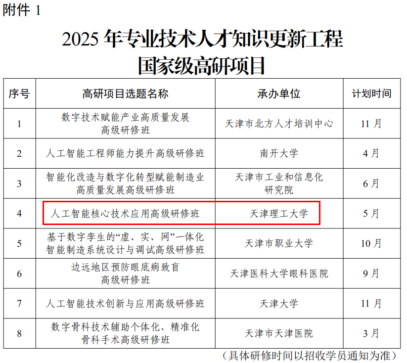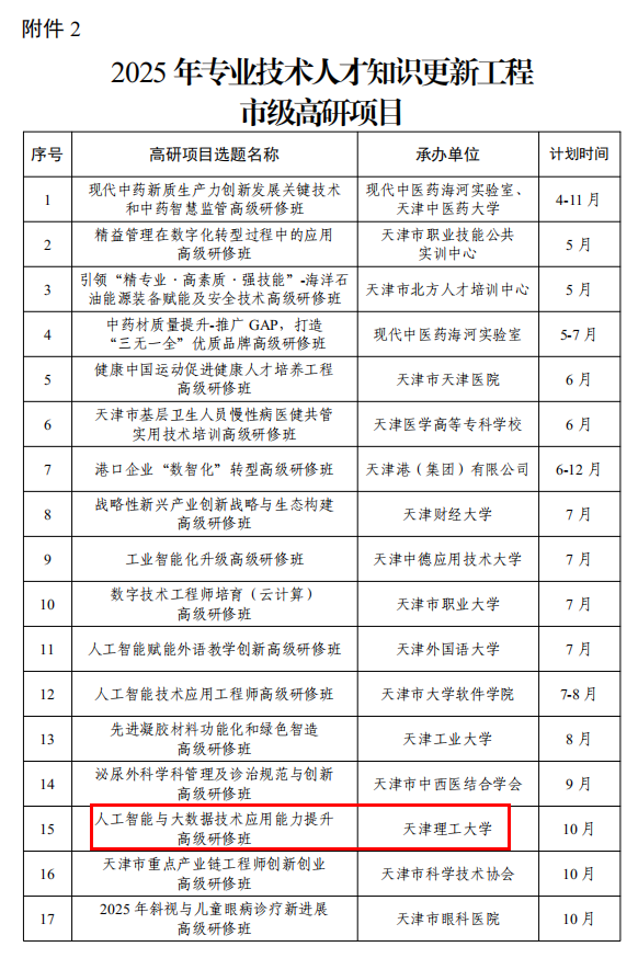近日,天津市人社局发布《市人社局关于公布2025年专业技术人才知识更新工程高级研修项目计划的通知》(津人社办函〔2025〕131号),贝博申报的“人工智能核心技术应用高级研修班”(国家级高研项目)和“人工智能与大数据技术应用能力提升高级研修班”(市级高研项目)均获批立项。