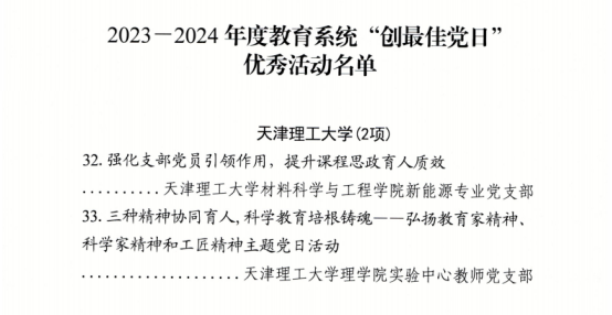 近日,在天津市教育系统2023-2024年度“创最佳党日”优秀活动评选中,贝博推荐的材料科学与工程学院新能源专业党支部“强化支部党员引领作用,提升课程思政育人质效”、理学院实验中心教师党支部“三种精神协同育人,科学教育培根铸魂——弘扬教育家精神、科学家精神和工匠精神”2项党日活动被评为2023-2024年度教育系统“创最佳党日”优秀活动。