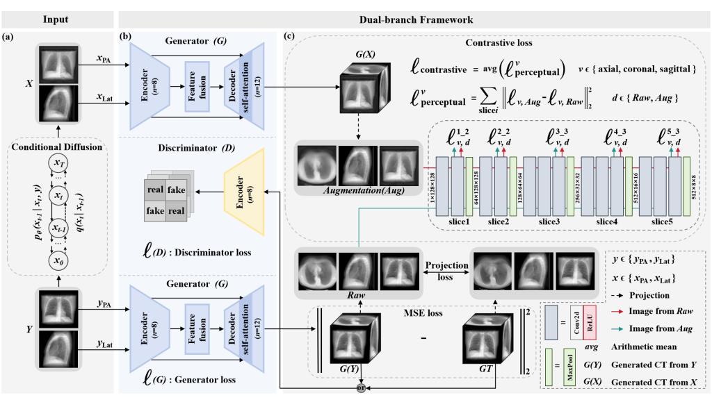 该研究聚焦于从X射线图像到CT图像的重建,针对因输入信息维度受限和输入样本不足而导致结构与纹理重建困难的问题,提出了一种基于条件扩散模型与对比学习的重建方案。该方案利用条件扩散模型对X射线图像进行骨骼抑制用于数据增强,有效缓解了二维输入信息不足的问题。同时,基于对比学习的双端网络联合构建了对比损失、投影损失以及GAN的对抗性损失并在一个端到端的统一框架中进行高效学习,显著提升了重建CT的结构和纹理质量。大量实验结果验证了该方案的优越性,所生成CT图像在PSNR、SSIM等关键指标上均达到SOTA水平,并呈现出较强的临床应用潜力。