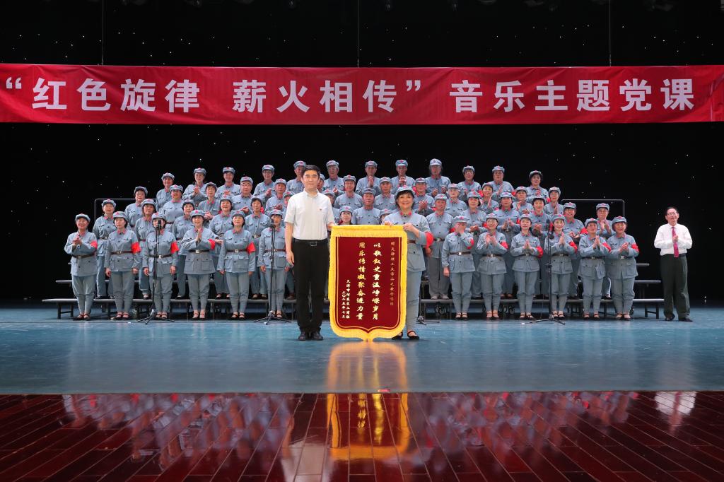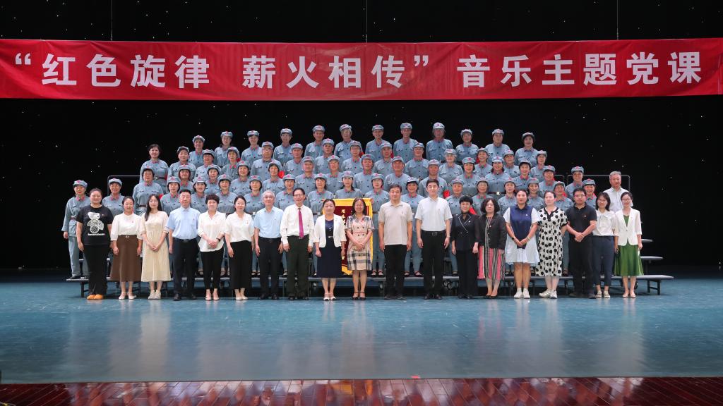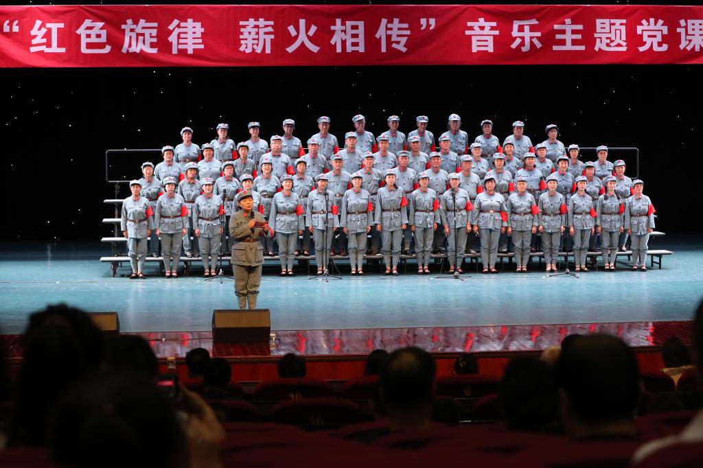 此次主题音乐党课的主讲人为学校关工委副主任马红健及学校山之歌合唱团。平均年龄74岁的合唱团以《长征组歌》中的《四渡赤水出奇兵》《到吴起镇》《大会师》三首经典歌曲开场。马红健结合历史和歌曲的创作背景、意义进行详细讲解,现场观众跟随着讲解与歌声,沉浸式进入烽火硝烟的时代,感悟信仰与力量。活动中,全体党员面向党旗重温入党誓词。李桂山、张嬿老师深情演唱《党的阳光照耀着祖国》,合唱团演唱《保卫黄河》。在全场高唱《没有共产党就没有新中国》的歌声中,音乐党课圆满落下帷幕。