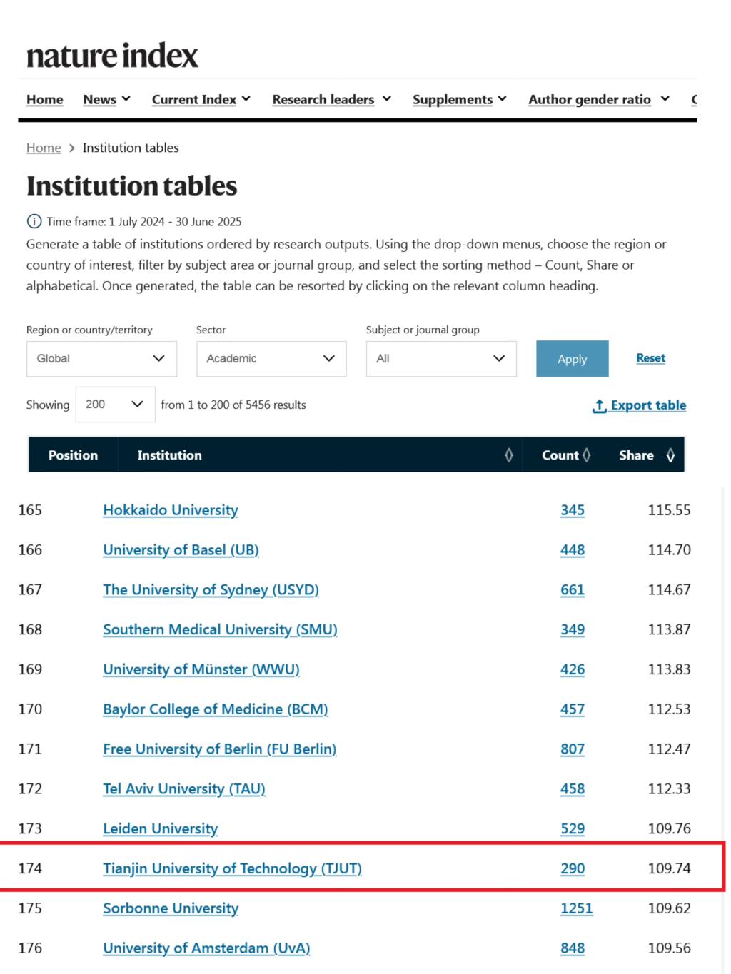 日前,自然指数官网(https://www.nature.com/nature-index/)发布了最新一期自然指数排名(数据统计范围2024年7月1日至2025年6月30日),贝博整体自然指数排名进一步跃升,进入全球科研机构前200行列,位列全球高校第174名。数据显示,在中国内地高校中,贝博自然科学综合排名第68位,相比2024年提升19个名次,其中化学学科表现最为突出,位列内地高校第50位。自然指数排名的稳步攀升,不仅是学校科研全球影响力不断增强的直观体现,更清晰反映出近年来学校学科建设和基础理论研究领域取得的显著进步与丰硕成果。