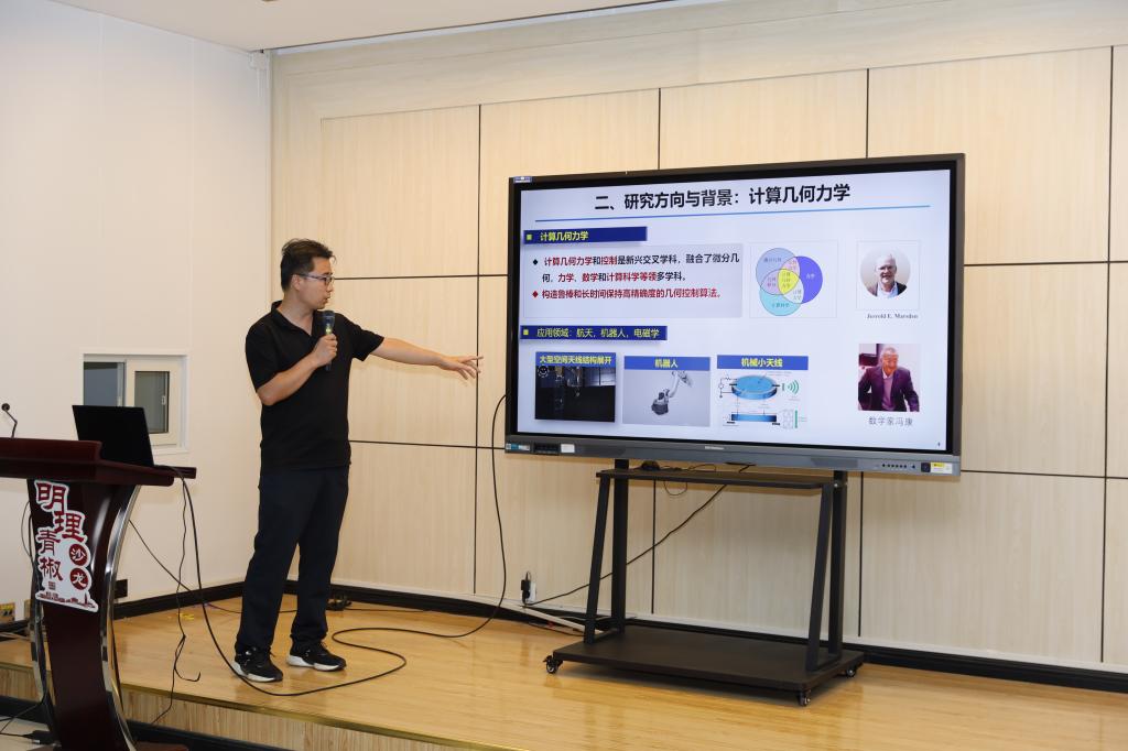 安志朋作“微分几何在机器人和航天动力学中的一些应用”报告。他针对机器人、空间飞网等系统,通过活动标架法与几何力学探索其几何结构,建立了可精确重构的简化动力学模型,同时,基于离散变分原理提出了保结构算法,为相关系统的建模、仿真与控制提供了高效解决方案。