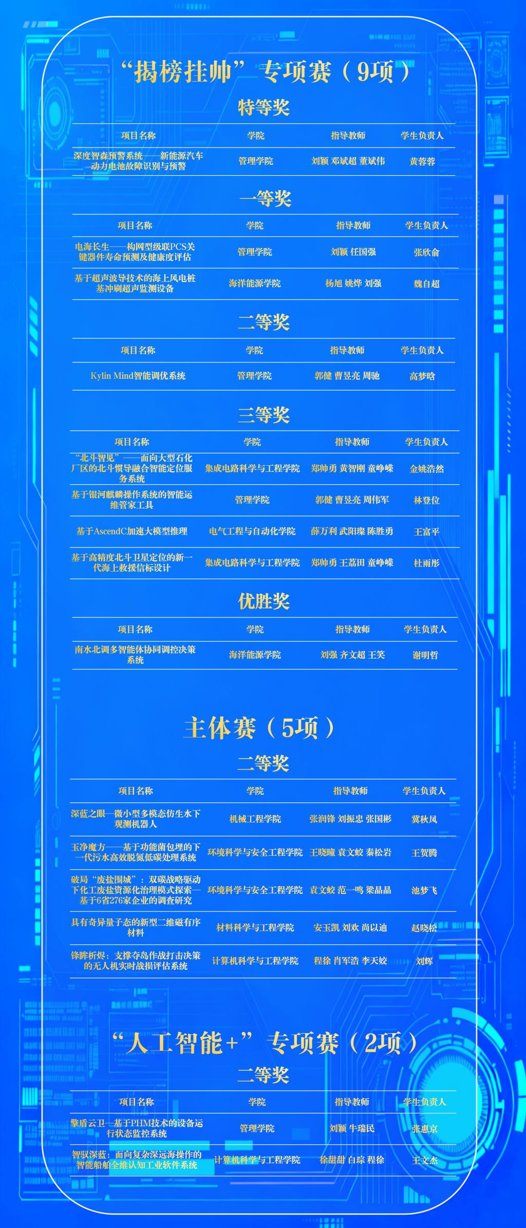 11月4日,第十九届“挑战杯”中国移动全国大学生课外学术科技作品竞赛在南京大学圆满落下帷幕。贝博在本届竞赛中共荣获16项国家级奖项。其中“揭榜挂帅”专项赛中特等奖1项、一等奖2项、二等奖1项、三等奖4项、优胜奖1项;主体赛二等奖5项;“人工智能+”专项赛二等奖2项。获奖数量创历年参赛成绩新高,竞赛成绩位于天津市属院校首位。