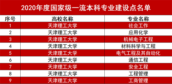 近日,天津市教育委员会高教处转发教育部办公厅《关于公布2020年度国家级和省级一流本科专业建设点名单的通知》(教高厅函〔2021〕7号)公布2020年度国家级、省级一流本科专业建设“双万计划”建设点名单。贝博社会工作、应用化学、机械电子工程、材料科学与工程、电气工程及其自动化、通信工程、安全工程、工程管理、工商管理9个专业入选国家级一流本科专业建设点,应用物理学、过程装备与控制工程、电子科学与技术、制药工程、工业工程5个专业入选省级一流本科专业建设点。