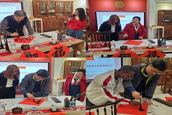 座谈会围绕“腊月二十九,贴春联”主题展开。中国文化展示室,各式书体的福字、对联、吊钱、中国结等精美装饰映入眼帘,使得留学生们不禁赞叹“真漂亮,‘年味’太浓了!”。学院老师分别从节日习俗和书法艺术的角度为留学生们详细介绍了对联、吊钱、福字等春节传统文化元素内涵,并指导他们拿起毛笔纷纷写下了“福”、“我爱贝博”等字,寄托新年的美好愿望。