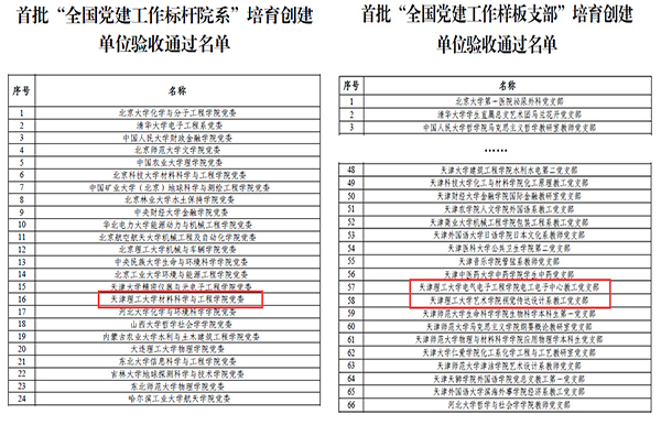 学校党委把抓好党建“双创”作为落实立德树人根本任务、推动学院各项事业发展的有力抓手和重要载体,统筹谋划、统一建设。工作启动后,学校各级党组织按照“六个过硬”“五个到位”“七个有力”的建设标准,坚持对标看齐,深入挖掘特色,积极建设申报。学校1个院级党委获批教育部首批“全国党建标杆院系”、2个党支部获批教育部首批“全国党建样板支部”,1个院级党委和2个党支部入选第二批全国党建“双创”培育创建单位,2个院级党委和4个党支部入选天津市党建“领航工程”创建培育单位,1个党支部入选天津市高校“双带头人”教师党支部工作室,3个研究生党支部和5名研究生党员入选“天津市研究生党建工作先进典型名单”。
