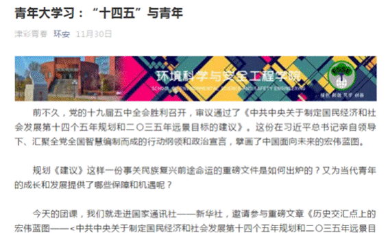 学院以党支部和团支部为单位,组织师生进行十九届五中全会精神集体学习研讨。各师生党支部围绕十九届五中全会会议公报、关于《中共中央关于制定国民经济和社会发展第十四个五年规划和二〇三五年远景目标的建议》的说明、天津市学习贯彻党的十九届五中全会精神宣讲提纲等组织全体师生党员进行了学习。以支部学习为契机引导青年学子保持政治定力,将自己的未来与国家的未来发展相结合,时刻关注国家政策,坚定不移跟党走,励志为开启全面建设社会主义现代化国家新征程贡献青春力量。