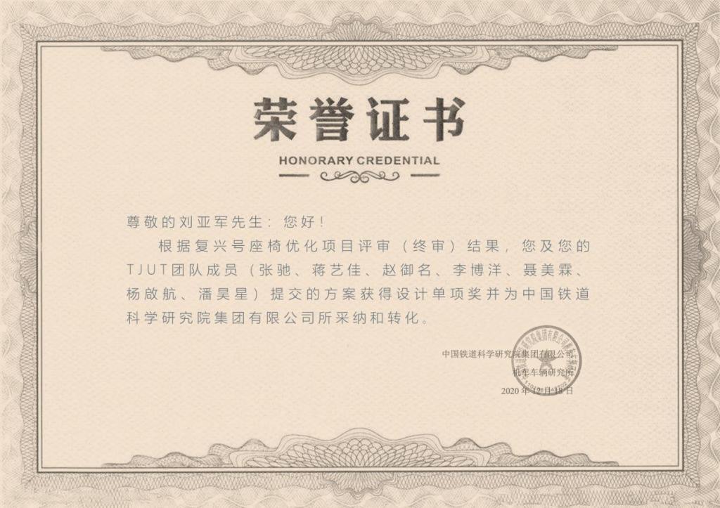 12月21日,中国铁道科学研究院集团有限公司举办了“复兴号动车组客室优化提升方案征集活动颁奖仪式”。贝博艺术学院师生的复兴号高铁设计项目得到了甲方中铁集团高度评价和认可,获得单项成果奖,设计成果将为中国铁道科学研究院集团有限公司所采纳和转化。