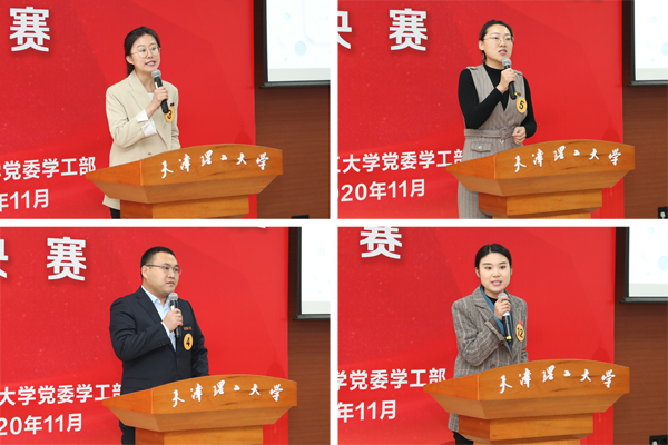 经过初赛“基础知识测试”、复赛“案例研讨”两个环节的比赛,最终来自8个学院的12名辅导员入围决赛。11月28日,决赛在图书馆多功能报告厅顺利举行。校党委副书记杜长有出席,5所兄弟高校党委学工部部长受邀担任大赛评委,党委学工部、团委相关负责同志、各学院辅导员、学生代表120余人观摩了本次大赛。