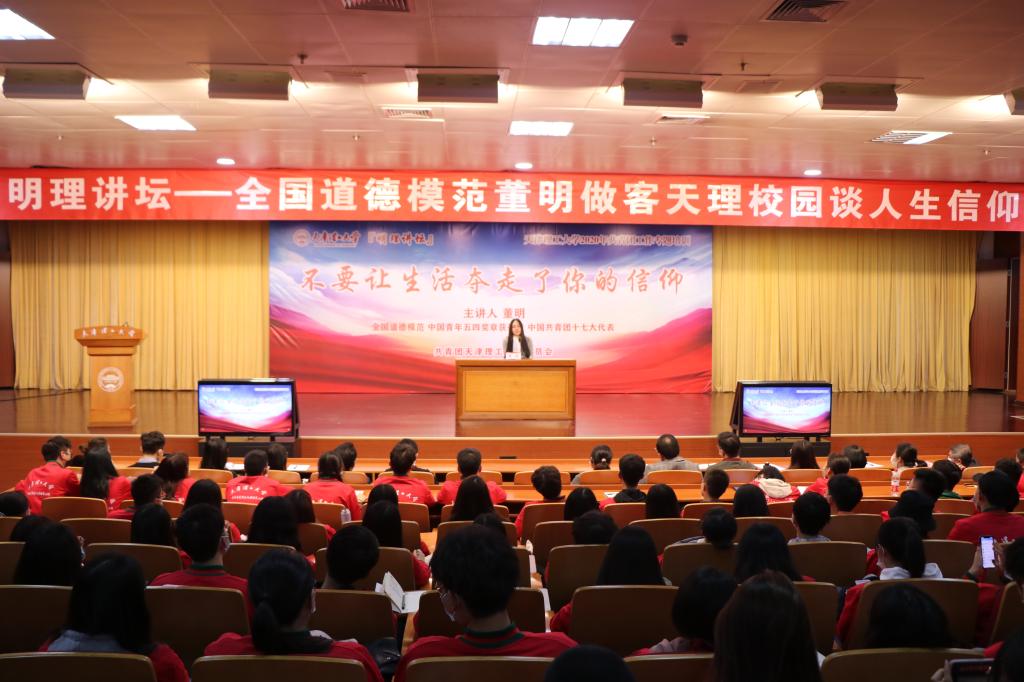董明是全国道德模范、中国青年五四奖章荣誉称号获得者,北京市青年五四奖章标兵,四川省抗震救灾模范。多次在北京奥运会、北京残奥会、上海世博会、广州亚运会等重大赛会上志愿服务。她成立的“武汉软件工程职业学院相信爱公益”“武汉青联董明爱心基金”,为青年学生和留守儿童助学圆梦,先后帮助了7000多个困难群体,帮助300多个绝望的生命走出阴影。“走到今天最大的骄傲是什么?”,“你为自己的人生准备了什么?”“你想为自己的人生和青春留下怎样印记?”董明用两个小时的时间,以“不要让生活夺走了你的信仰”为题,讲述了自己受伤后在各界的支持和帮助下,重返校园实现求学梦想、留校任职从事育人工作、融入社会开展志愿服务的成长经历,表达了“初心如磐”爱党、爱国、爱人民的坚定信念,“不懈努力”坚持、拼搏、奋斗的青年选择,“使命在肩”担当、有为、奉献的人生追求。