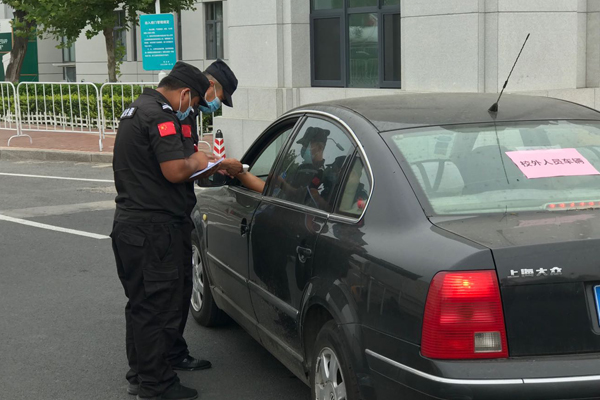 在学校秀川路东门,入校管理分为学生步行、学生家长驾车、教职员工驾车、校外人员驾车等四个场景进行模拟演练。安保人员逐一核实入校人员身份,校外人员还需扫码登记个人信息,身份信息确认无误,查验健康码“绿码”,经测温正常后方可入校。