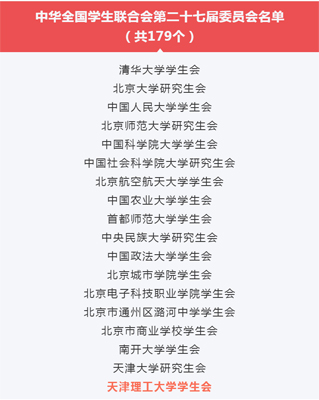 大会选举产生了179个全国学联第二十七届委员会团体委员单位。其中高等学校学生会101个,高等学校和科研教育机构研究生会19个,中等学校学生会48个,国外中国留学生组织11个,贝博学生会当选中华全国学生联合会第二十七届委员会委员单位,天津共有5所高校学生会入选。