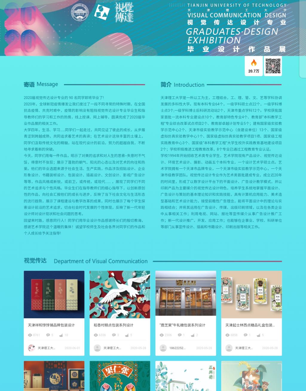 日前,艺术学院2020届视觉传达设计专业本科毕业设计展推出了线上展览。展览包括“课程思政、植根高校”、“文化传承、设计创新”和“文化品牌设计服务”三个主题篇章90部毕业设计作品,是视觉传达设计系全国样板党支部牵头组织将毕业设计与学生价值引领相结合,实现思想和专业方面的双提升,深入发掘课程的思想政治教育资源,结合当下热点问题,打造适合艺术人才培养特色的“课程思政”作品展。