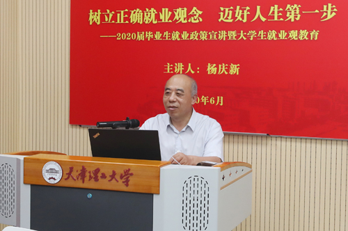 杨庆新在报告会上重点解读了《天津市关于进一步促进2020年高校毕业生就业工作的若干措施》,要求大家要树立正确就业观念,先就业,再择业,在实践中磨练自己、提高自己,在未来的职业发展中占据主动;要提前做好求职准备,向优秀学兄学姐学习求职技巧,认真撰写求职简历,抓住每一个符合自身条件的就业机会,尽快落实工作岗位;要增强就业信心,相信自己在学校里积累的专业知识、养成的综合素质,一定能够助力自己找到合适的工作;要提高安全意识,保护好个人生命和财产安全。