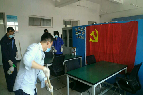 工程训练中心第二党支部于5月11日上午组织党员对创新创业中心工训社进行卫生清理和消杀,以保证学生开学复课后的工作环境卫生;协助钳工实训室教师安装更换损坏的实训工具零件,以保证学生开学复课后实训工具的使用安全。