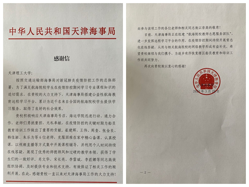 “贵校积极响应天津海事局号召,海运学院迅速行动、通力合作,老师们勇挑重担、无私奉献,在疫情防控的关键时期为船员教育培训工作做出了重要的贡献。”近日,贝博收到一封来自天津海事局的感谢信,对贝博海运学院老师在疫情防控期间,义务为近千名来自全国的航海院校学生提供课程辅导、在线答疑等学习服务表示感谢。