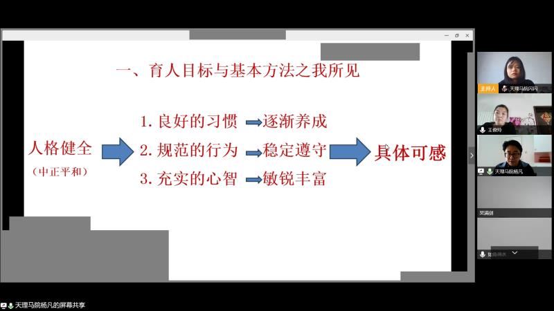 邢巍巍老师基于理论与实践的结合,阐述了通过“循序渐进、螺旋上升”的一体化思政育人体系,逐步培养学生的政治认同、国家意识、文化自信和人格养成。