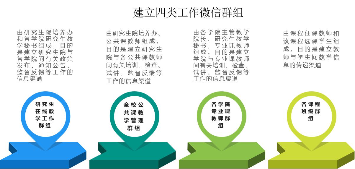 精心策划,打通渠道,制定在线教学计划和应急预案。研究生学院及时转变教学管理方式,组织建立四类工作微信群组,打造高效沟通渠道:
