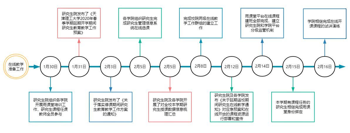 梳理春季学期研究生课程,与网络教学平台确认服务技术保障;部署雨课堂在线教学平台技术培训,对接相关数据;制定网络授课期间研究生在线教学应急预案,在雨课堂授课出现网路堵塞或其它故障等突发情况,及时采取备用方案(腾讯会议,瞩目微信小程序,微信群聊,qq视频通话等替代方式)进行教学,在正式开学之前组织全校完成在线教学的演练。