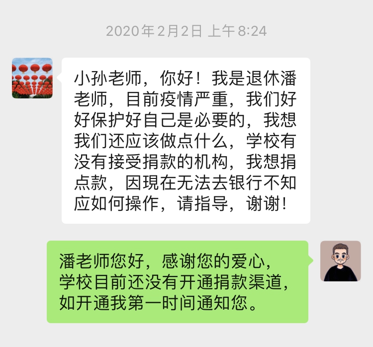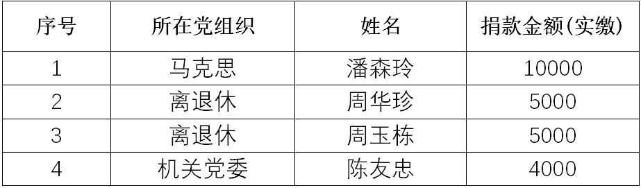 自新冠肺炎疫情防控阻击战打响以来,全校党员密切关注疫情状况,潘森玲等同志多次主动与学校联系,希望通过捐款捐物等方式为抗击疫情尽绵薄之力。2月29日,在收到贝博组织党员自愿捐款的通知后,潘森玲同志捐款10000元,周华珍、周玉栋两位老同志各捐款5000元,陈友忠同志捐款4000元用于疫情防控。