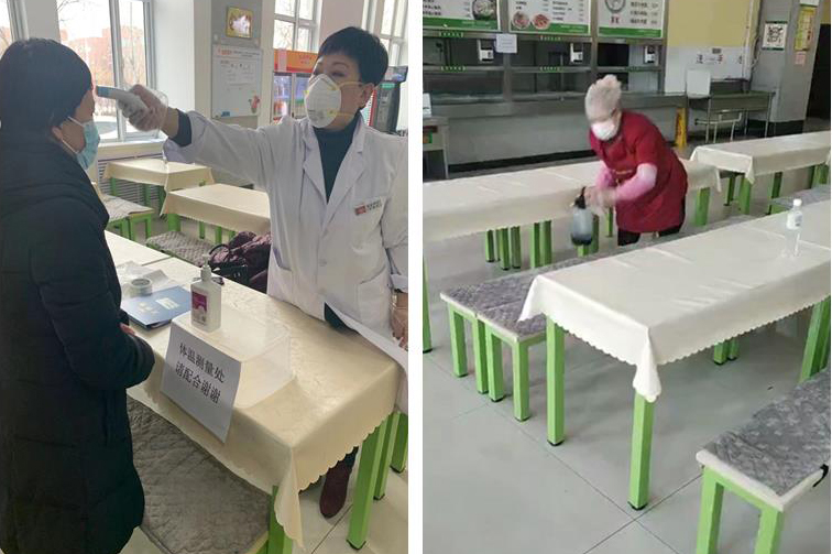 在膳食服务保障方面,在食堂入口处设置体温测量处,体温测量合格后方可进入餐厅,要求就餐师生饭前用消毒洗手液洗手。鼓励师生将餐食打包带离餐厅分别就餐,减少聚集。加强餐食供应质量,早餐提供牛奶、鸡蛋等,午晚餐增加菜品种类,并免费提供水果,增强在校师生的抵抗力。每日早餐和晚餐闭餐后对餐厅进行全覆盖式消毒。此外,膳食中心每日安排食品安全管理人员检查后厨卫生和加工操作,了解食材库存,并及时储备,确保师生用餐安全可靠。