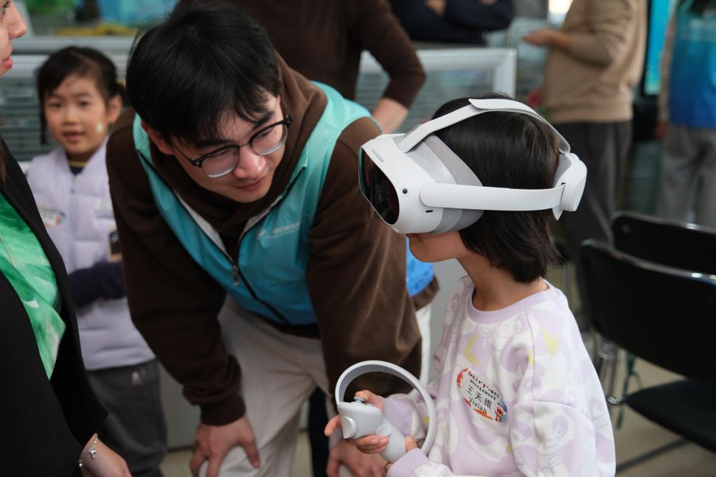 智网互联实验室的中外研究生同学为小朋友们讲解了“数字孪生”的概念和中拉友好的壁画,并指导大家通过VR体验、互动游戏等环节感受生物多样性与数字科技的有机融合。