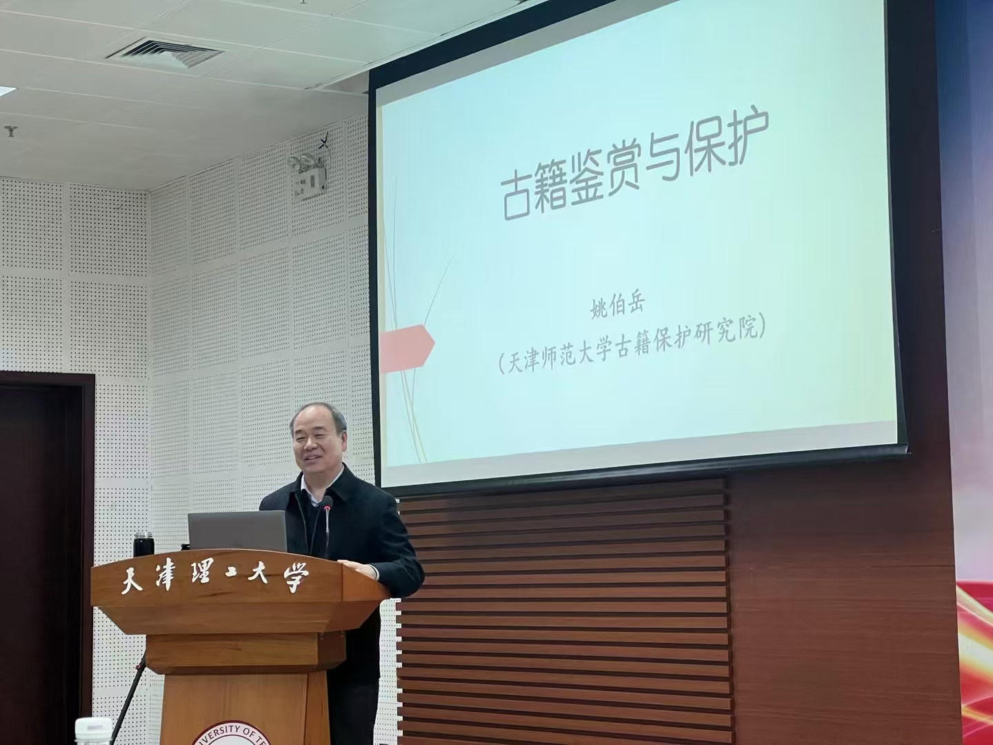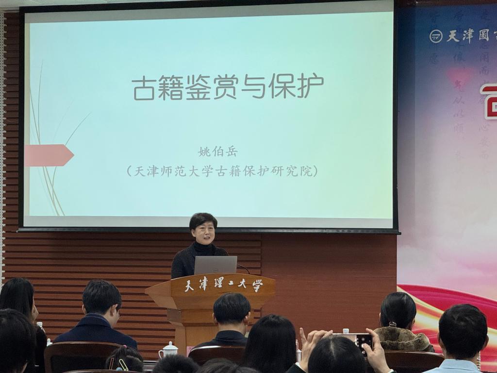 活动邀请天津师范大学古籍保护研究院常务副院长、中国古籍保护协会古籍编目专业委员会主任、中国图书馆学会阅读推广委员会阅读史研究专业组副主任姚伯岳作“古籍鉴赏与保护”的专题讲座。他通过珍贵的图片、丰富的实例,以生动的语言为现场师生介绍了古籍的涵义、现存古籍种类、古籍装帧之美、书法之美、印章之美、古籍保护经验做法等内容,鼓励大家从养成爱好古籍开始,增强古籍保护意识、提高古籍保护技能、为古籍保护贡献力量。