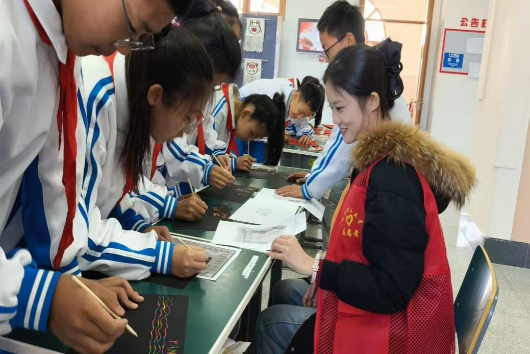 志愿队还在课后组织学生参与了传统文化的体验活动。从延安精神的刮画到皮影戏,从活字印刷到单色剪纸,大家在体验中感受延安精神以及中华优秀传统文化的魅力。