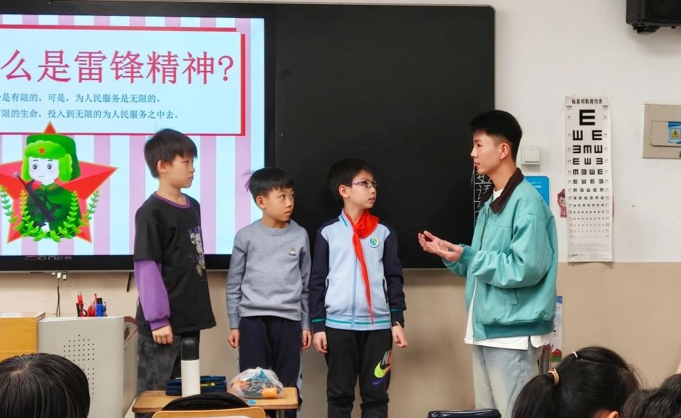 在互动交流环节,宣讲团成员们与小学生们展开了热烈讨论。面对孩子们提出的一个个问题,成员们耐心解答,并结合自身参与志愿服务活动的经历,引导孩子们感悟雷锋精神,从小树立远大理想,刻苦学习知识,努力成长为对社会有用的人才。
