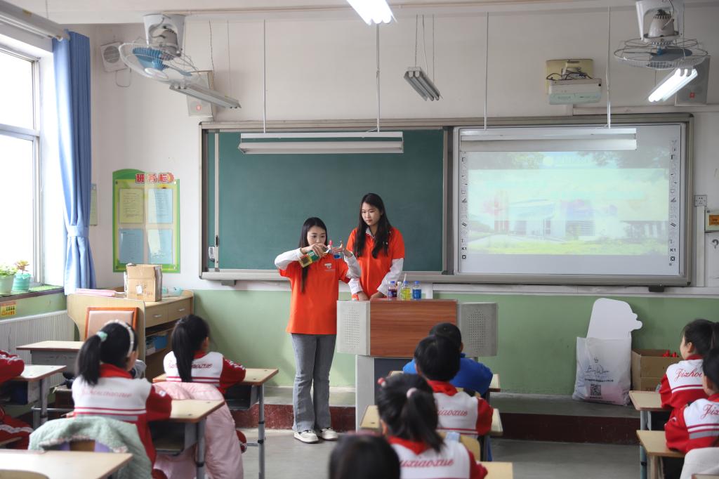 在科普实践环节,志愿者们通过“科学探秘三部曲”教学模式,开展“变色水壶”“泡沫反应”等多个趣味实验。40余名小学生认真观察了酸碱反应、溶液变色等科学现象。在“军旅育苗”环节中,退役大学生许亚倩以“我的迷彩青春”为主题,通过军营故事分享、内务规范教学等互动形式,帮助孩子们树立纪律意识与家国情怀。这种“扶智+扶志”的育人模式,深入落实教育系统“学雷锋做志愿服务改革建新功”主题实践活动。活动最后,学院教师为东太河中心小学捐赠图书。