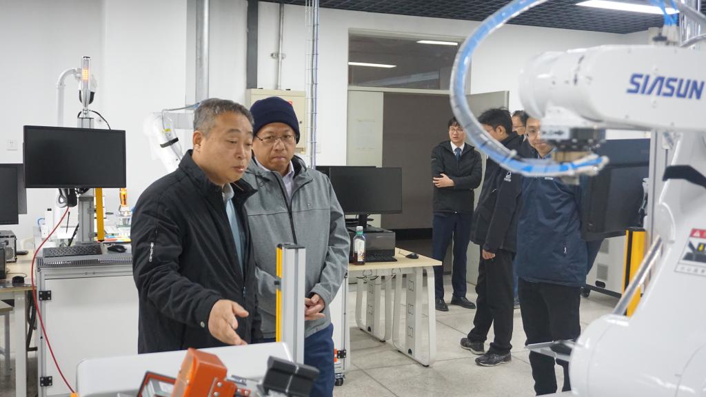 参观伊始,工程训练中心相关负责人对智能机器人综合实训平台的建设过程、设备情况、授课情况等作了详细介绍,并重点介绍了目前中心利用平台教学对新工科课程改革培养目标的实施路径及未来愿景。代表团对这一实践成果给予了高度评价。随后双方就机器人控制系统开发、人工智能算法应用及跨学科项目制教学模式展开技术研讨,互相分享优秀案例和经验。Prof.Ding表示,中心将工程实践与理论创新深度融合的育人模式,为中美工程教育合作提供了创新样本。
