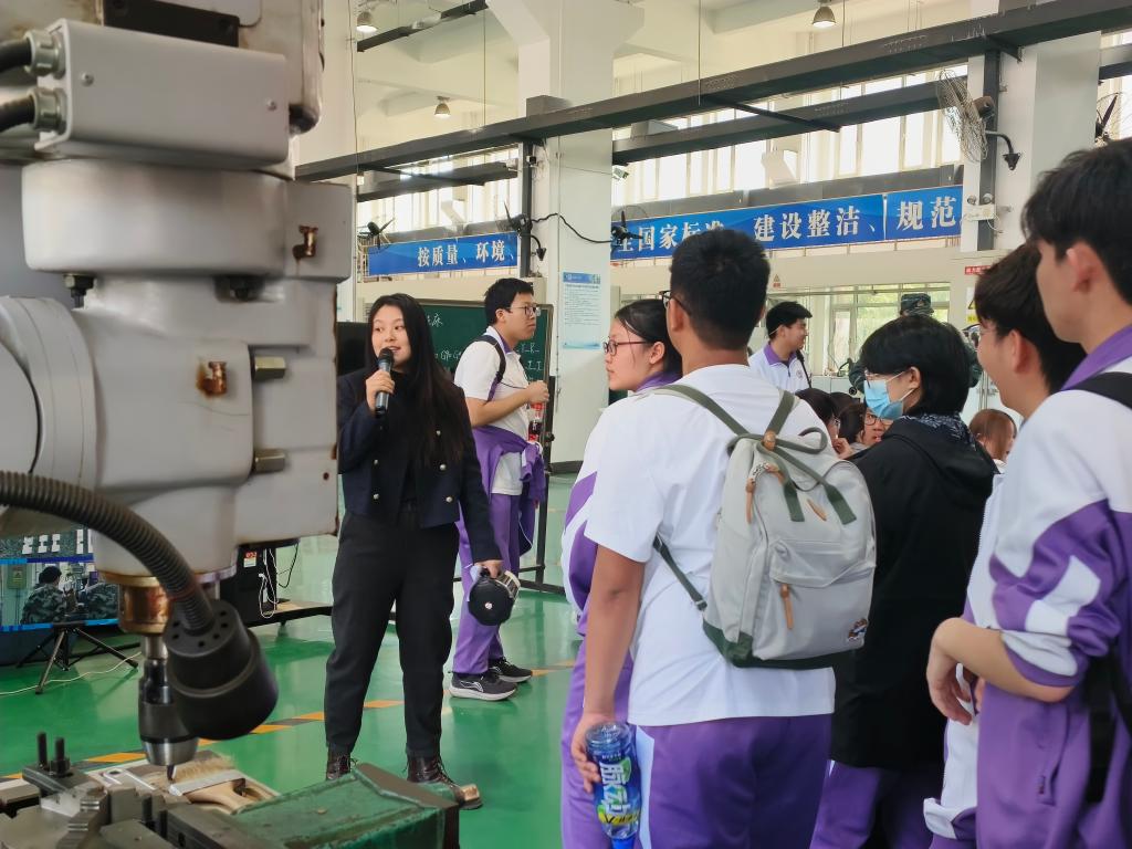 活动围绕智能制造领域的核心环节,精心设计了五大特色课程模块。一是传统加工设备探秘。学生走进精密机械加工车间,在专业教师指导下参观车床、铣床等设备,感受工业制造的“基础基因”。二是走进智能机器人实战课堂。学生通过编程与操控协作机器人完成识别、搬运等任务,直观体验人工智能与机械工程的融合应用。三是探索电子陀螺创客工坊。学生动手焊接、调试陀螺仪电路,结合传感器原理设计智能平衡装置,将理论知识转化为科技作品。四是开展智能工厂全景模拟。学生利用虚拟仿真技术,化身“未来工程师”,参与数字化生产线规划与工业机器人调度,感受智慧制造的协同魅力。五是进行新工科专业前沿对话。学校招生工作办公室负责同志为同学们讲授了一堂大学专业解析讲座,详细讲述了智能制造、人工智能等新兴专业的发展趋势与就业前景,启发学生做好生涯规划。