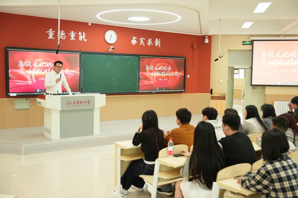 深入解读了习近平总书记视察天津重要讲话精神,围绕落实“以文化人、以文惠民、以文润城、以文兴业”重要要求,结合生动鲜活的案例,深刻阐述了文化在城市发展、社会进步以及个人成长中的重要作用。他表示,作为艺术学院的学生,肩负着传承和弘扬中华优秀传统文化的使命,在艺术创作与设计选题中,要牢牢立足天津深厚的地域文化底蕴,以艺术的语言讲好天津故事,展现天津魅力,让津派文化在新时代焕发新的生机与活力,进一步传递中国文化的开放、包容与创新精神。