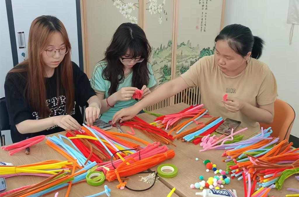 活动现场,五彩斑斓的扭扭棒、花蕊、精致花饰等整齐摆放。在主持人的耐心讲解和示范下,同学们纷纷动手创作,将普通的扭扭棒巧妙弯折、缠绕,打造出立体饱满的玫瑰;有人将扭扭棒弯折成爱心形状,点缀在花束中传递心意,为作品增添独特魅力。活动最后,大家互相交流心得,现场气氛热烈而融洽。