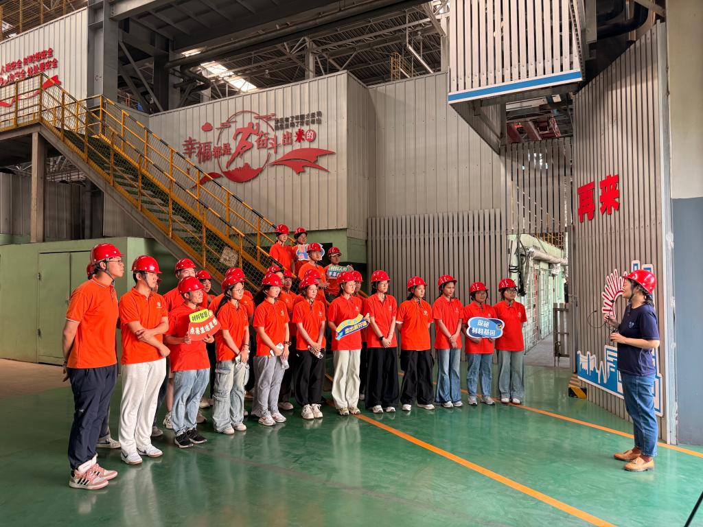 学院教师陈雨琳在板材车间内结合高速运转的生产线讲授材料科学理论,引导学生思考如何将专业知识转化为服务国家重大需求的实践能力。