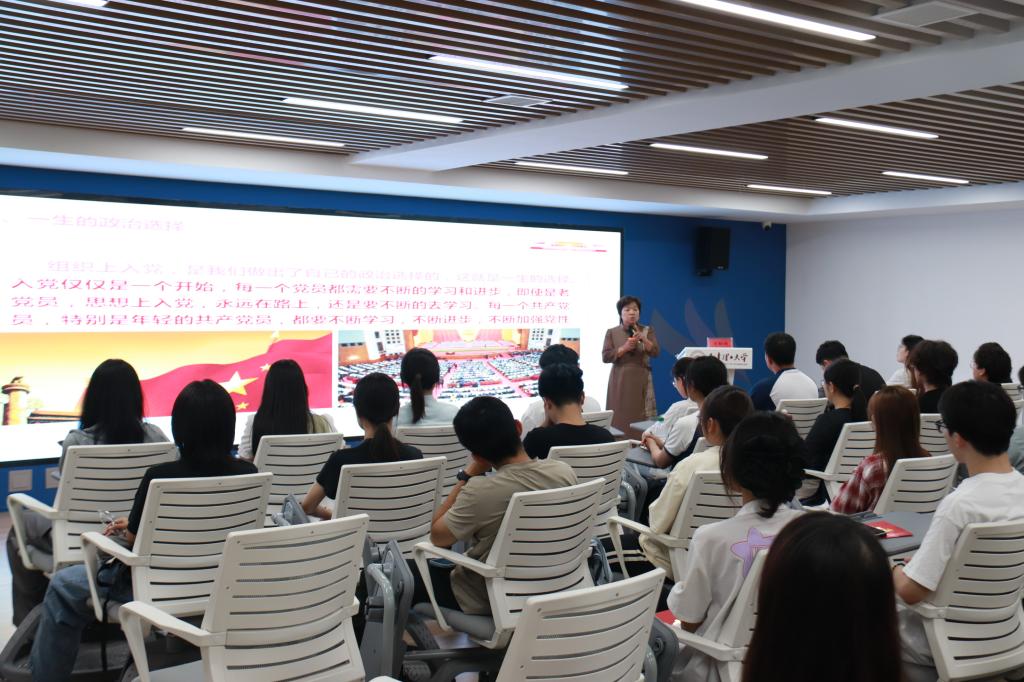 活动中,学院为毕业生党员庆祝“政治生日”并颁发贺卡。毕业生党员代表号召全体党员要始终牢记党员身份,铭记母校的谆谆教诲,在更广阔的天地刻苦奋斗、建功立业。随后,与会老师为新发展党员佩戴党员徽章。学院党委主要负责同志领誓,全体党员面向党旗进行庄严宣誓,重温入党誓词。每位党员都接受了一次精神洗礼,更加深切地感受到身为新时代共产党员的责任和担当。新发展党员代表表示,要坚持合格党员标准,自觉遵守党的纪律,以坚定的理想信念、良好的思想作风,为党的事业贡献自己的青春和力量。