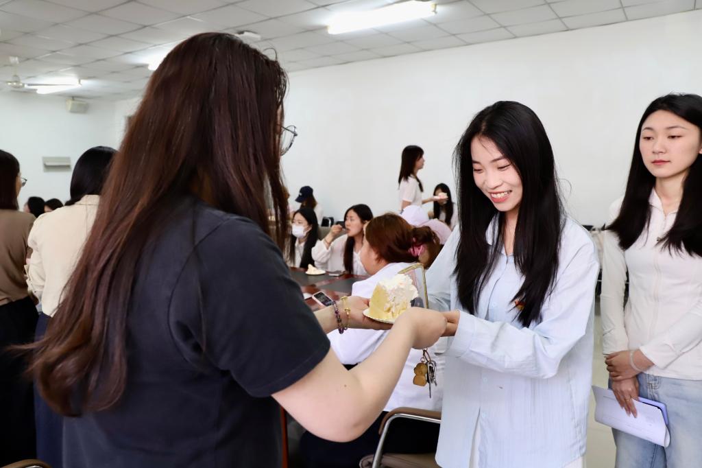 在“最后一场政治生日会”上,学院为毕业生党员精心准备了生日蛋糕。党员们围坐在一起,分享着这份特殊的甜蜜,在切分蛋糕的过程中,畅谈入党以来的成长感悟与心路历程。党员们在温馨的氛围中,进一步强化了身份认同感与归属感,也让这场生日会成为镌刻在记忆深处的红色印记。