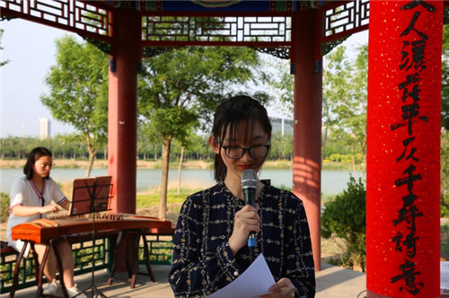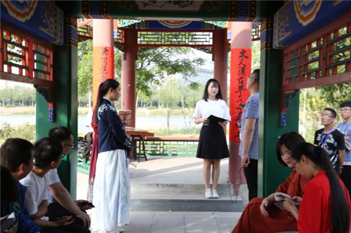 高山流水,知音难觅。随着一曲古筝——《高山流水》的应和,擂台赛正式开始。一撇一捺,水墨丹青,参赛选手抽取诗词意象,句句诗词脱口而出,篇篇佳作耳熟能详。筝声也随着比赛的跌宕起承转合,为现场营造了一份雅致。“诗词协奏飞花万里宫商,文人洒落平仄千寻诗意。” 比赛间隙,文心诗社同学的雅音更是锦上添花。万千中华传统文化的精髓在此刻凝聚迸发,贝博湖畔,阵阵雅音。